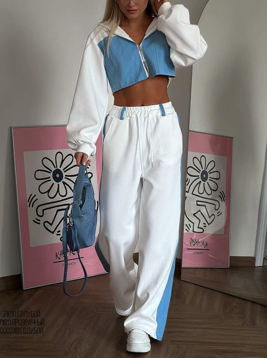 Color block Zipper Hooded Sweatshirt Loose Wide-leg Pants Two-piece Set
