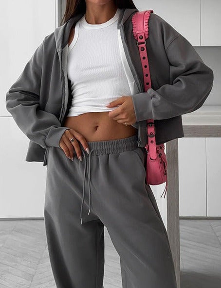 Casual Short Hooded Sweatshirt Straight Trousers Two-piece Set