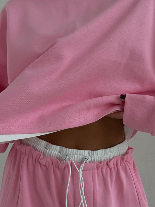 Long Sleeve Round Neck Contrast Color Sweatshirt Set