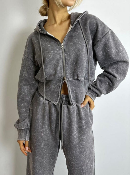 Long-sleeved Zippered Design Distressed Hooded Sweatshirt Suit
