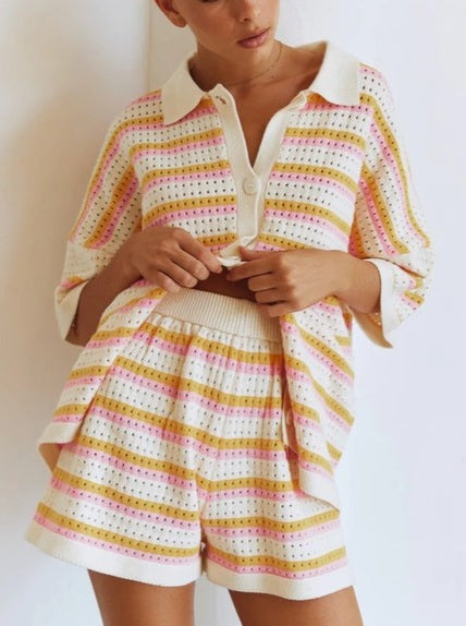 Contrast Striped Loose Knit Cardigan Shorts Set