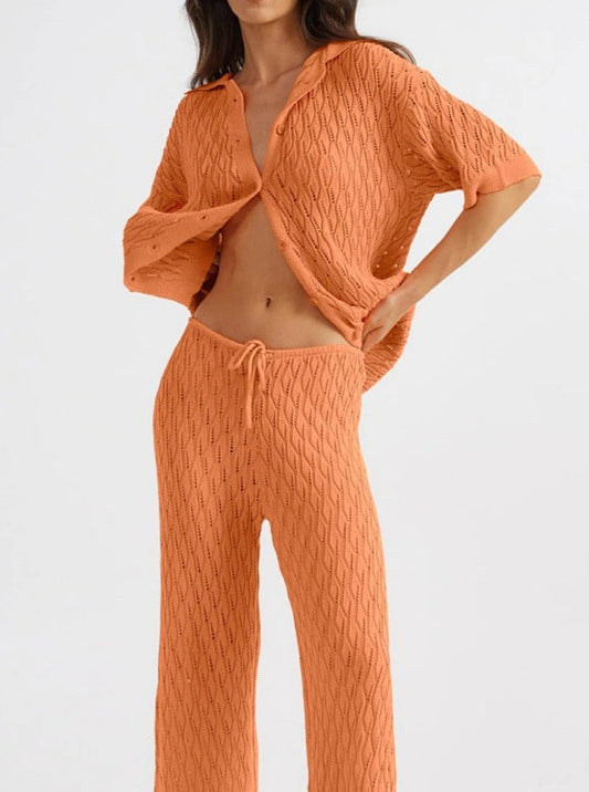 Knitted Hollow Top Wide-leg Pants Sweater Two-piece Set
