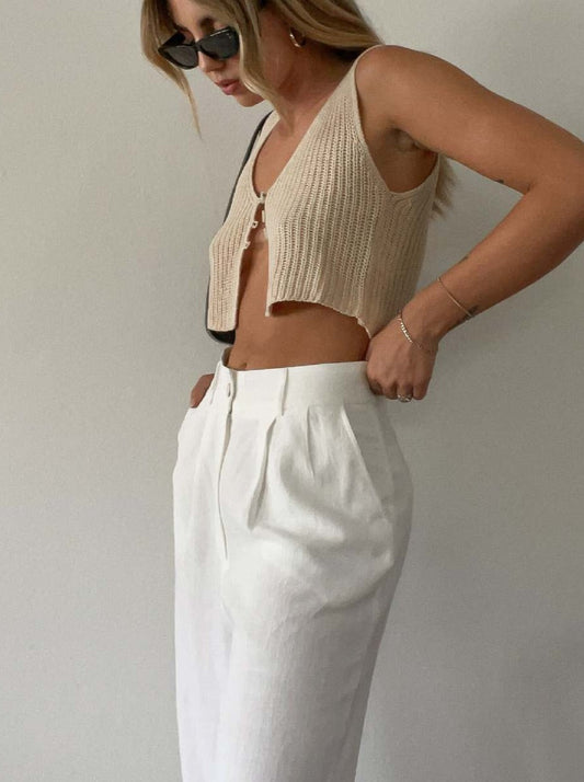 100% Linen Crop Top V-Neck Waistcoat Vest