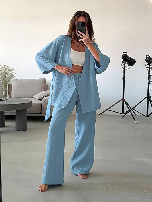 Cotton Cardigan Tie Robe Pajama Set